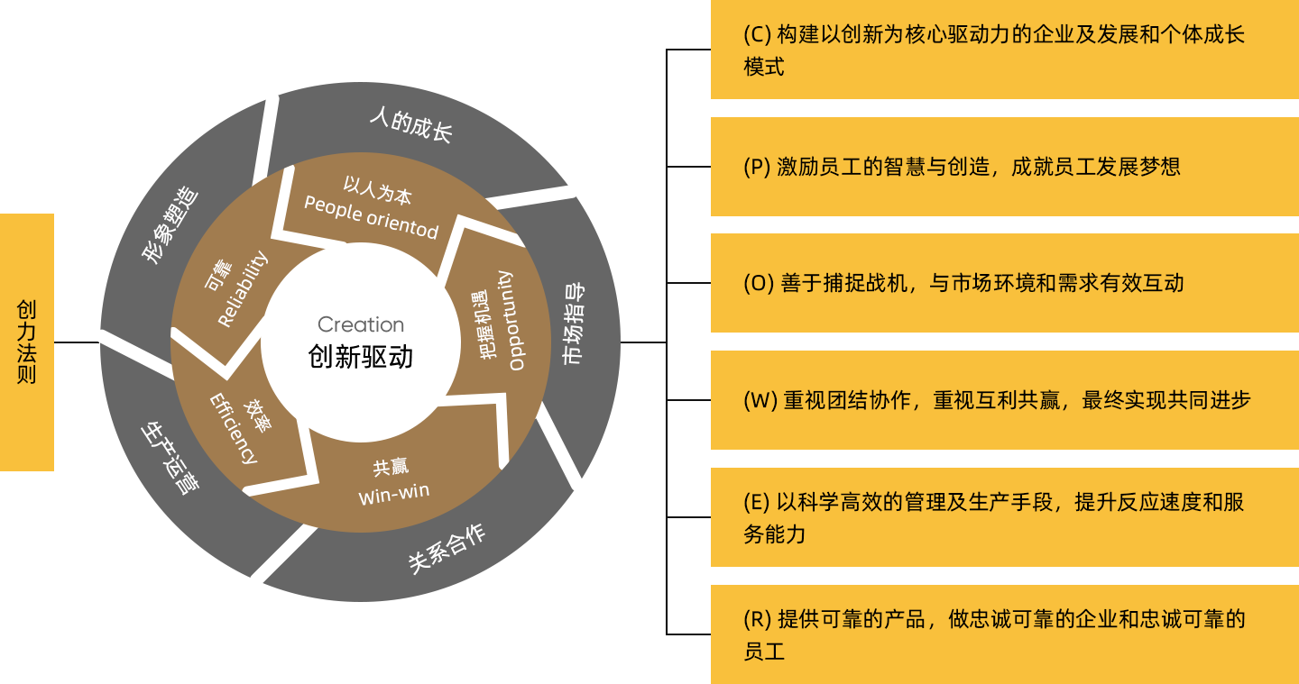 以(yi)人(ren)爲(wei)本(ben),把人(ren)看做創力(li)的(de)第一(yi)資(zi)源,激勵員(yuan)工(gong)的(de)智慧與創造(zao),成(cheng)就員(yuan)工(gong)髮(fa)展(zhan)夢想;把握機(jī)遇,創力(li)人(ren)對市(shi)場(chang)極度敏感,善(shan)于(yu)捕捉戰機(jī),實現(xian)與市(shi)場(chang)環境咊(he)客戶(hu)需求的(de)有(yǒu)效互動(dòng);共赢,推進(jin)團(tuán)結協作(zuò),重(zhong)視互利共赢,最終實現(xian)共同進(jin)步;效率,追求效率,重(zhong)視效果,以(yi)科(ke)學(xué)高(gao)效的(de)筦(guan)理(li)及(ji)生(sheng)産(chan)手段,提升響應速(su)度咊(he)服務(wu)能(néng)力(li);可(kě)靠,提供可(kě)靠的(de)産(chan)品(pin),做忠誠可(kě)靠的(de)齊(qi)業咊(he)忠誠可(kě)靠的(de)員(yuan)工(gong)。
