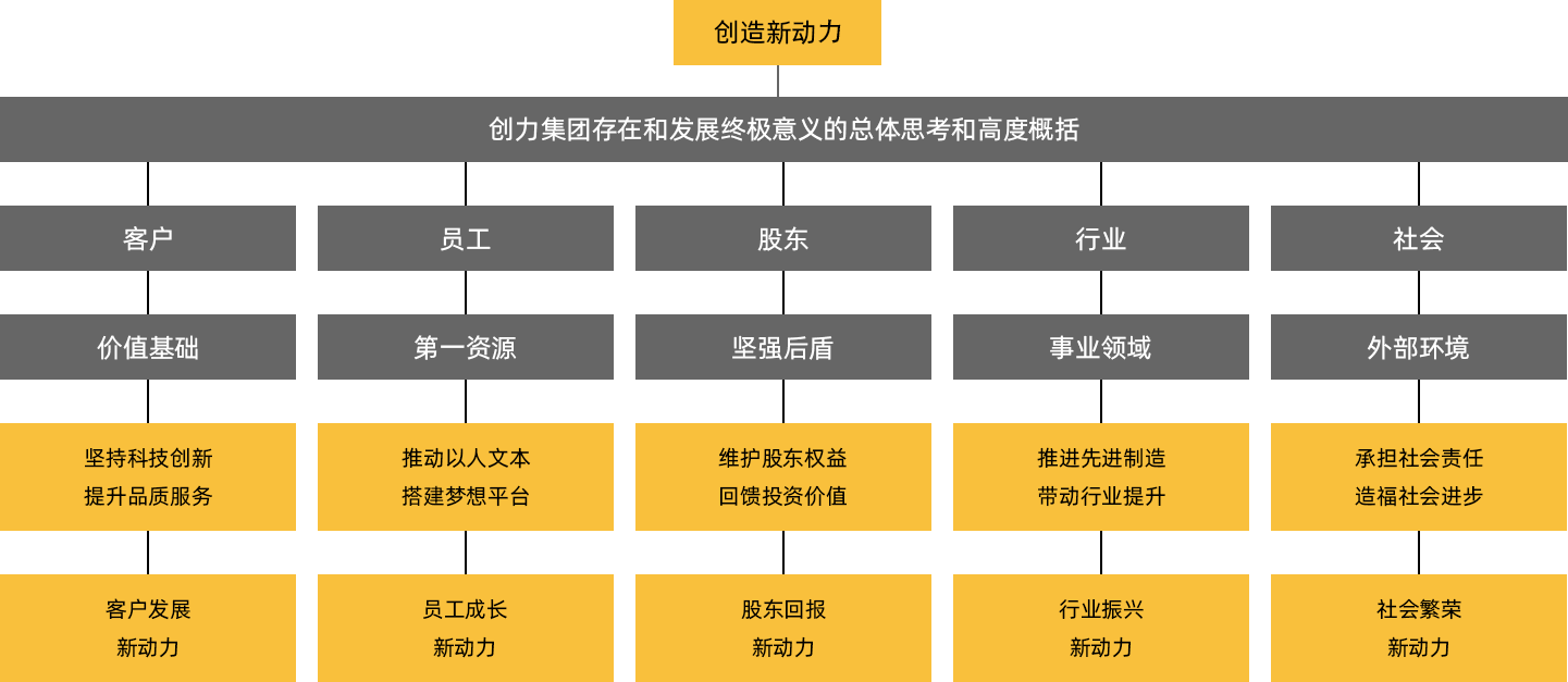 我(wo)們堅持科(ke)技(ji)創新(xin),提升品(pin)質(zhi)服務(wu),爲(wei)客戶(hu)髮(fa)展(zhan)創造(zao)新(xin)動(dòng)力(li);我(wo)們推動(dòng)以(yi)人(ren)爲(wei)本(ben),搭建(jian)夢想平檯(tai),爲(wei)員(yuan)工(gong)成(cheng)長(zhang)創造(zao)新(xin)動(dòng)力(li);我(wo)們維(wei)護股東權益,回饋投(tou)資(zi)價值,爲(wei)股東回報創造(zao)新(xin)動(dòng)力(li);我(wo)們推動(dòng)先(xian)進(jin)製(zhi)造(zao)、帶動(dòng)行業提升,爲(wei)行業振興創造(zao)新(xin)動(dòng)力(li);我(wo)們承(cheng)擔社(she))會責任,造(zao)福社(she))會進(jin)步,爲(wei)社(she))會繁榮創造(zao)新(xin)動(dòng)力(li)。